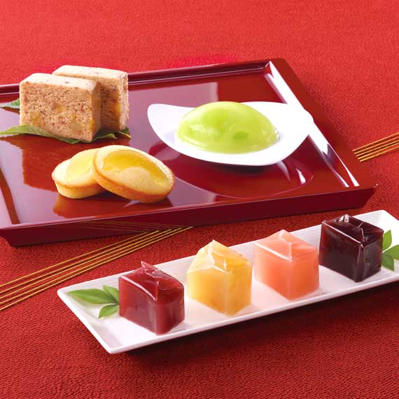 - 栗カステラ94kcal・白桃フィナンシェ119kcal・メロンの果70kcal・果実ようかん(いちご132kcal、りんご127kcal、ブルーベリー125kcal、白桃127kcal)