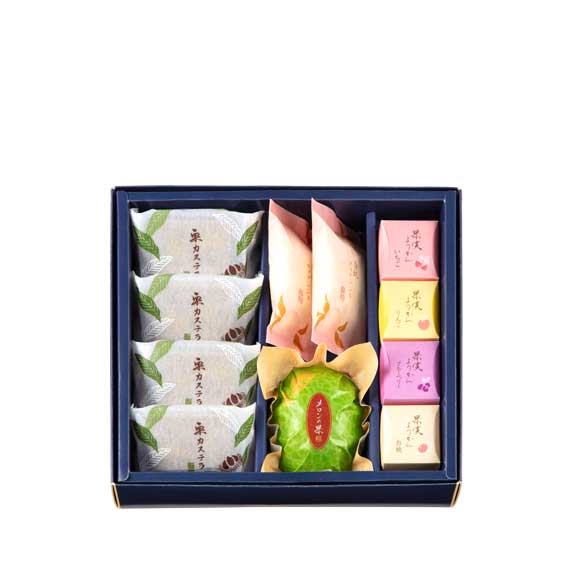 - 栗カステラ4・白桃フィナンシェ2・メロンの果1・果実ようかん(いちご、りんご、ブルーベリー、白桃)各1