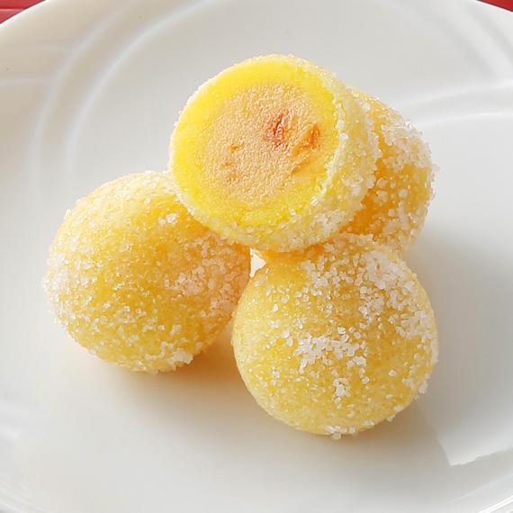 外側のあんは金柑の酸味や独特の苦みを生かした風味豊かなあん、中のあんはきざんだ金柑の皮の食感がアクセントになったあんです。