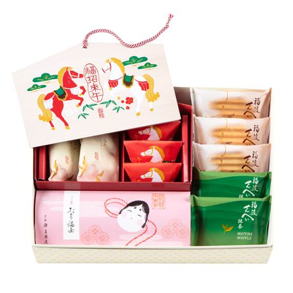 - 絵馬福招来(白桃フィナンシェ2・干支羊羹 午3)1・お多福面4・福渡せんべい3・福渡せんべい抹茶2